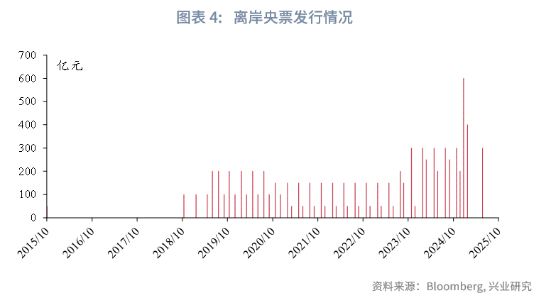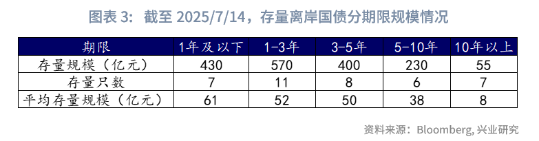 从离岸央票来看,离岸央票在香港市场发行,在发行时间和发行期限方面,第一笔离岸央票在2015年发行,2018年起,离岸央票的常态化发行,发行时间通常在2月、3月、5月、6月、8月、9月、11月、12月,发行期限主要为3个月、6个月、1年。在发行规模方面,2015年以来,离岸央票累计发行规模11550亿元,其中1个月、3个月、6个月、1年的央票累计发行规模200亿元、4500亿元、3200亿元、3650亿元;往年离岸央票年度发行规模在1500亿元附近,但2024年以来离岸央票发行规模上行,2025年、2025年1-7月,离岸央票发行规模分别为2750亿元、1500亿元,2025年单笔离岸央票发行规模最高达到600亿元,规模也较往年明显上升。在存量方面,当前存量离岸央票1400亿元,存量笔数5笔,剩余期限(规模)分别为0.1年(600亿元)、1.3年(150亿元)、4.3年(150亿元)、5.2年(300亿元)、7.2年(200亿元)。
