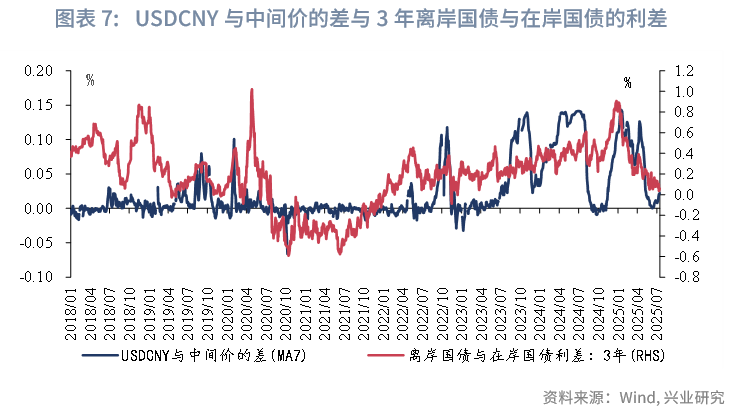 2024年11月至2025年1月,USDCNY自7.1附近上行至7.3附近,USDCNY与中间价的差自0附近上行至0.14左右,3年离岸国债与在岸国债的利差中枢自45bp附近上行至90bp左右(本轮利差快速走阔也有在岸利率快速下行的助推)。