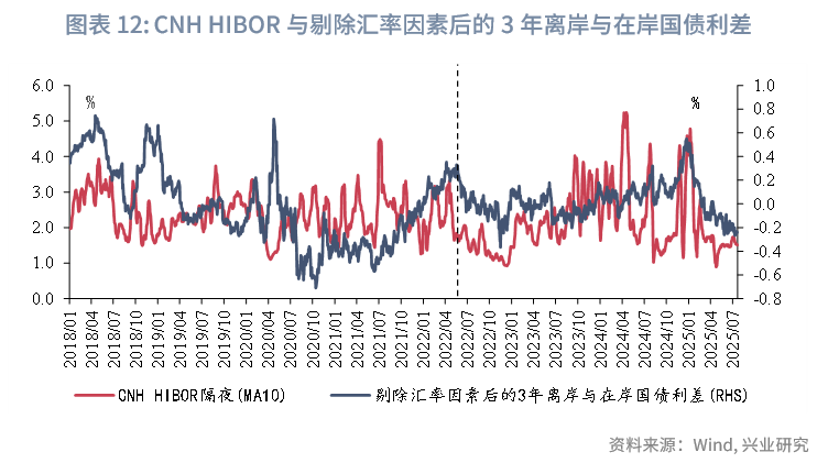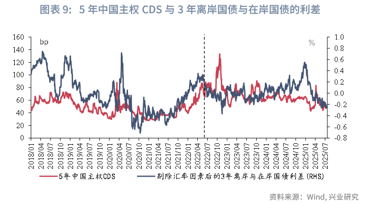从今年以来的情况来看,USDCNH高位回落,人民币小幅升值,离岸资金市场流动性充裕,CNH HIBOR大幅下行(今年以来CNH HIBOR与剔除汇率因素后的3年离岸与在岸国债利差的相关性高达80%),关税冲击持续时间较短,5年中国主权CDS短暂冲高后回落,上述因素共同助推了今年以来3年离岸国债与在岸国债利差的下行行情。