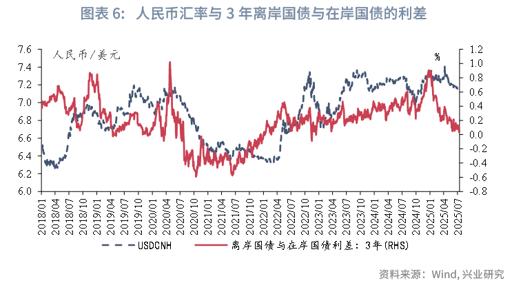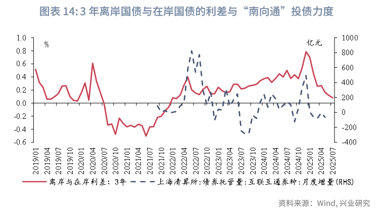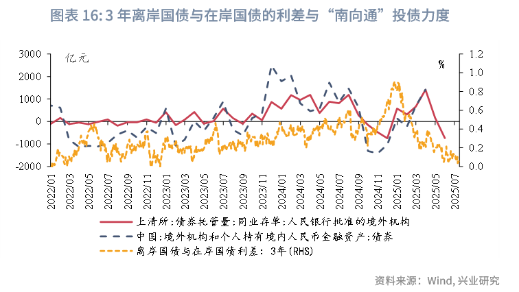 值得注意的是,未来“南向通”的境内投资者范围将进一步扩容。2025年7月8日,人民银行和香港金管局在“债券通周年论坛2025”上指出“完善债券通南向通运行机制,支持更多境内投资者走出去投资离岸债券市场,近期拟扩大境内投资者范围至券商、基金、保险、理财等四类非银机构”。非银机构的加入可能使得离岸人民币市场的“交易属性”和活跃程度增强。同时,需要关注南向通的年度总额度和每日额度是否会拓宽以及离岸人民币债券供给情况,若南向通的投资者范围扩大后,需求增长明显高于供给增长,可能使得离岸人民币债券与在岸人民币债券的利差压缩。