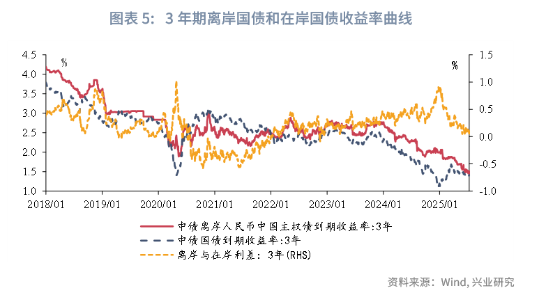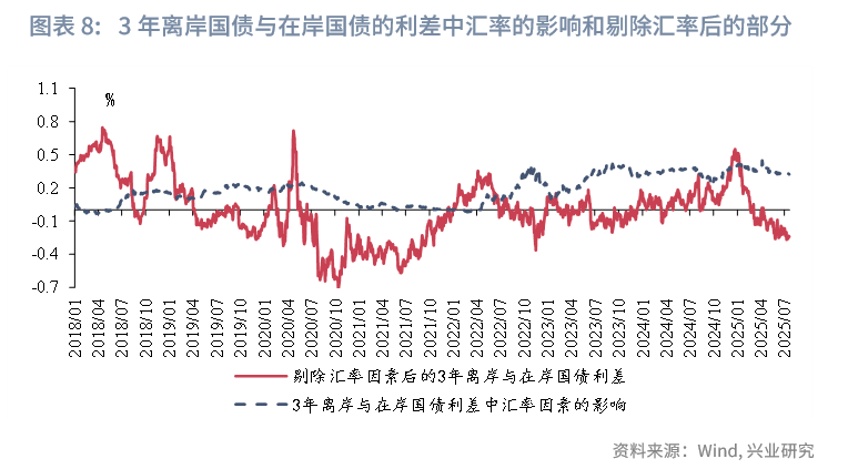 而2022年下半年至今,5年中国主权CDS与剔除汇率因素后的3年离岸与在岸国债利差的相关性降至-18%,彼时疫情扰动逐渐消退,5年中国主权CDS在大部分时间段内都不是影响剔除汇率因素后的3年离岸与在岸国债利差波动的主要因素。但若事件性冲击再起,5年中国主权CDS的影响会阶段性增强。典型时期2025年4月初(特朗普“对等”关税政策超预期),彼时5年中国主权CDS快速上行,剔除汇率因素后的3年离岸与在岸国债利差阶段性上升。