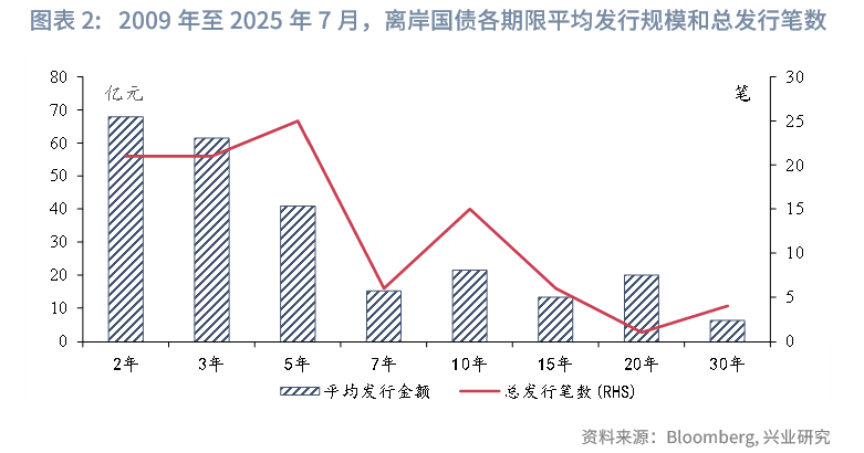 在发行结构方面,2009年以来至2025年7月,财政部离岸国债的发行期限主要为2年、3年、5年、7年、10年、15年、20年、30年,其中,2年、3年、5年的发行笔数和平均发行金额较大,其余期限的发行笔数和平均发行金额较小。在存量结构方面,当前存量的离岸国债中,剩余期限为1年及以下、1-3年、3-5年、5-10年、10年以上的规模[3]分别为430亿元、570亿元、400亿元、230亿元、55亿元,单券平均存量规模分别为61亿元、52亿元、50亿元、38亿元、8亿元。
